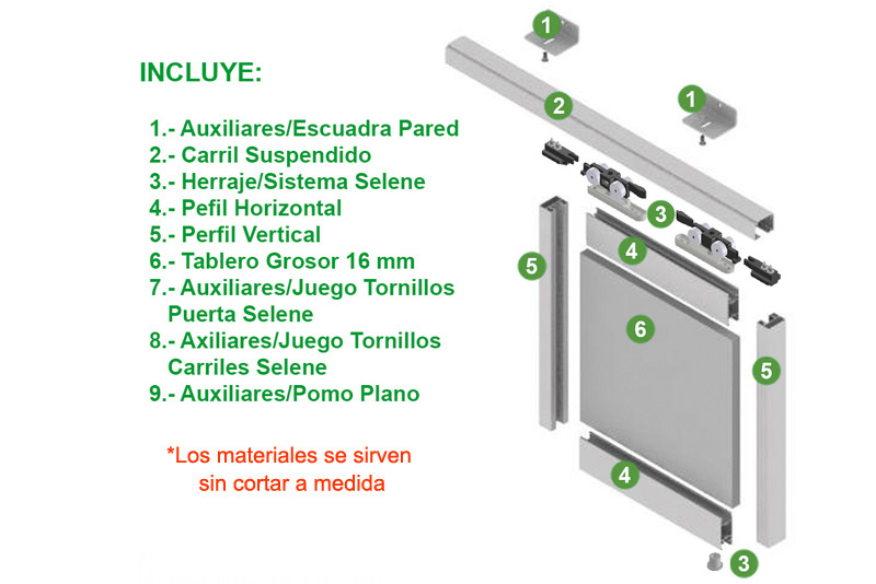 Si compras en Kit (equivale a una puerta), te remitiremos todos los materiales componentes salvo: Tableros y Cristales. Se incluyen los Carriles. Las medidas de los Carriles son: 2.000 mm, 2.500 mm y 3.000 mm (en caso de superar los 3.000 mm, se sirven cortados a mitad). Incluye también la tornillería y escuadras si fueran necesarias. Tendrás que fabricar la puerta/puertas ajustando las medidas.
